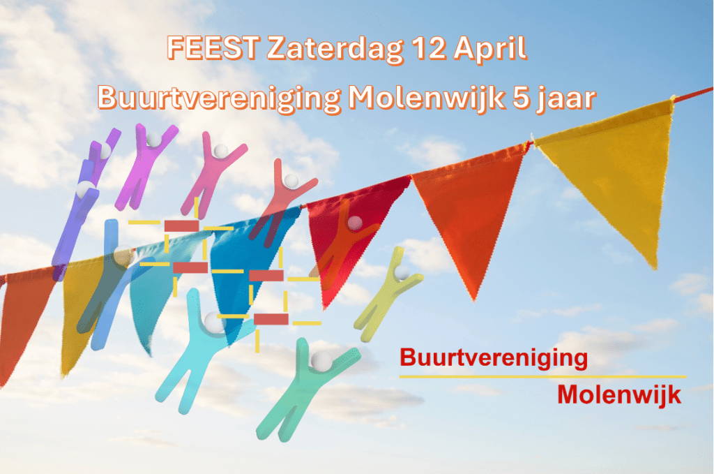 Buurtvereniging Molenwijk nodigt graag iedereen uit met ons te vieren dat we 5 jaar bestaan. Op zaterdag 12 april van 14 tot 17 uur bij Oba Molenwijk. Er is een kleurwedstrijd, er kan worden geschaakt, het Molenwijkkoor treedt op. Er zijn danslessen, er wordt geschminckt en er is henna-tekenen.